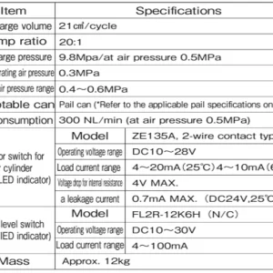 Discharge volume 21 cm3/cycle, Discharge pressure 9.8 MPa/at air pressure 0.5 MPa, Air consumption 300 NL/min